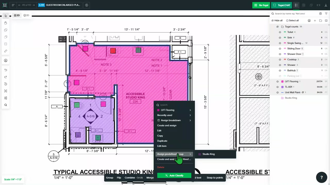 Tip: Use the Togal AI search to type, search and locate as many identical units with the same count name in the drawing.